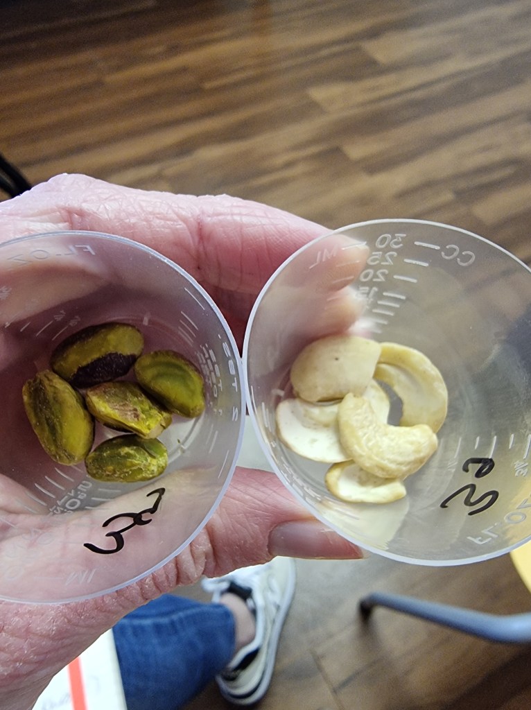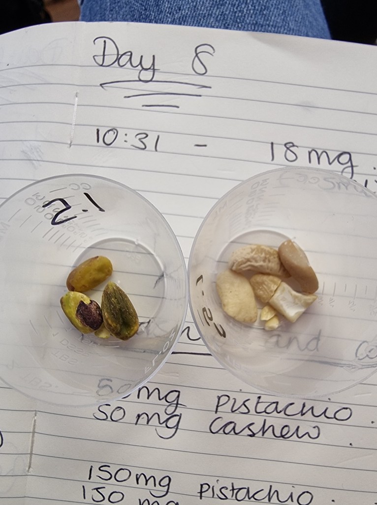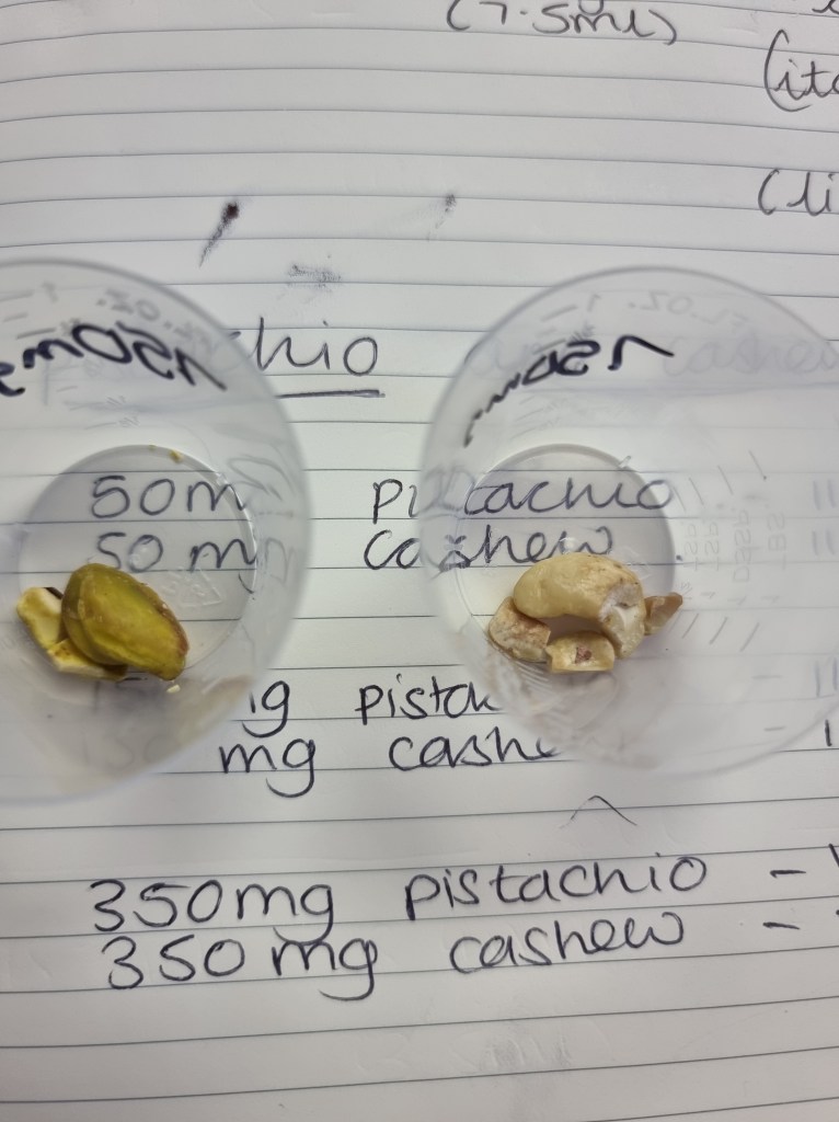 We started at 75mg until we reached 3g and I am so pleased to report that…. I PASSED!!!!! Cleared to eat pistachios and cashews 🩷😄 taste – wasn’t fussed but they are plain, raw nuts with no roasting/salt etc!