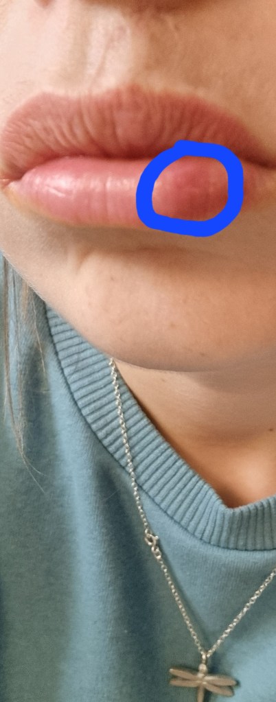 Evening dose of 25mg taken after a tummy full of homemade marinara pasta. It was delicious! Again same symptoms as this morning and a little hive on my lip. I’ve attached a picture 📸. They do disappear eventually though.